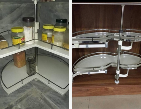 A 3/4 Carousel in kitchen products typically refers to a type of storage solution or organizer used in kitchen cabinets. The term "3/4 carousel" refers to a shelving system that has rotating or circular shelves, allowing easy access to items stored within the cabinet. Optimum use of the bind corners. Rotating units according to space available in the corners . Dee Carousel & Full Round Carousel can be fitted in cabinets wherever the style and space management is required.