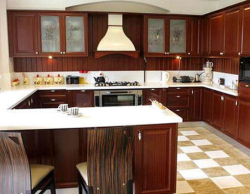 A G Shaped Modular Kitchen is a kitchen layout that resembles the letter "G" when viewed from above. It is a modification of the U-shaped kitchen design with an additional peninsula or island attached to the U-shaped layout, creating a G-like shape. This design is often utilized in larger kitchens to provide additional counter space, storage, and sometimes seating.